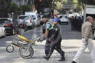 MÉXICO, D.F., 09ENERO2014.- Una mujer policía de la SSP-DF acompañan a un trabajador de la empresa Ecoparq para colocar inmolizadores en automóviles que se encuentran mal estacionados. FOTO: SAÚL LÓPEZ /CUARTOSCURO.COM