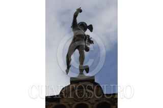 MÉXICO, D.F., 10ENERO2014.- Una escultura de Mercurio posa sobre una marquesina de un edifico en la calle de 16 de septiembre en el Centro Histórico, este dios griego era el mensajero de los dioses. FOTO: MOISÉS PABLO /CUARTOSCURO.COM