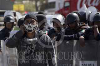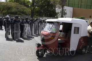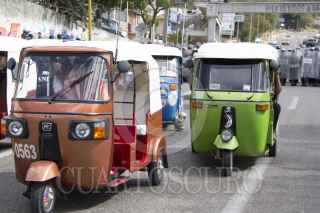 OAXACA, OAXACA, 13ENERO2014.- Elementos de la Policía Estatal y Municipal retiraron un bloqueo que realizaron moto taxistas pertenecientes a la agencia de Trinidad de Viguera quienes exigen el cese de invasión de rutas por parte de moto taxistas de la agencia de Pueblo Nuevo. FOTO: ARTURO PÉREZ ALFONSO /CUARTOSCURO.COM