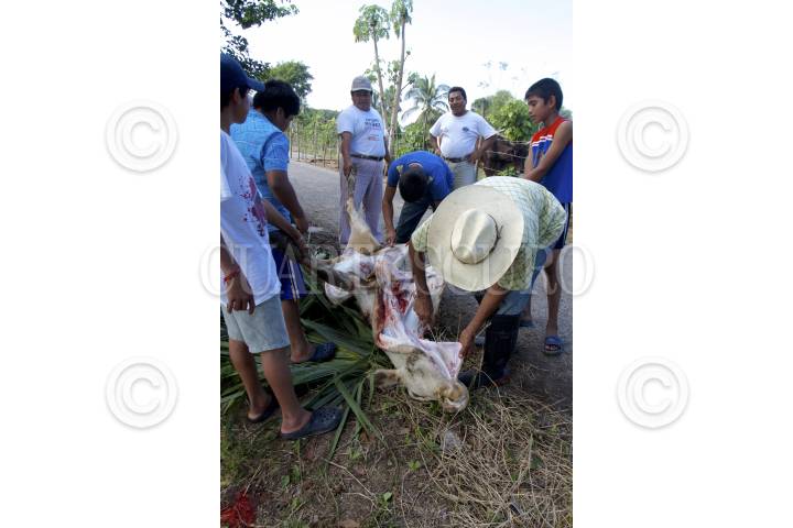 CENTLA, TABASCO, 13ENERO2014.- Habitantes en la ranchería Chichicastle destazaron una res que minutos antes murió ahogada en los caudales del río Usumacinta. Debido a la falta de comida los pobladores se ven en la necesidad de aprovechar al máximo los alimentos. FOTO: MARCO POLO GUZMÁN HERNÁNDEZ/CUARTOSCURO.COM
