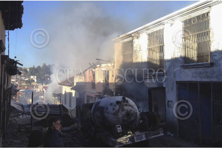 COMITAN DE DOMINGUEZ, CHIAPAS, 16ENERO2014.- Esta mañana una pipa cargada con 10 mil litros de gas LP explotó y dejó al menos seis heridos y diversos daños materiales en la zona del Centro Histórico. Autoridades policiales informaron que hasta el momento no se reportan pérdidas humanas, pero sí daños materiales a viviendas, entre ellas una propiedad de Roberto Albores Guillén, ex gobernador del estado. FOTO: CUARTOSCURO.COM