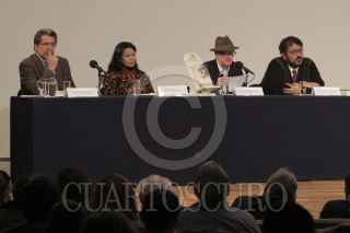 MÉXICO, D.F., 19ENERO2014.-. Rafael Pérez Gay, Josefina Estrada, Francisco Hernández y Guillermo Vega Zaragoza durante la Presentación-homenaje de Ricardo Garibay, en la sala Manuel M Ponce del Palacio de Bellas Artes. FOTO: GUILLERMO PEREA /CUARTOSCURO.COM