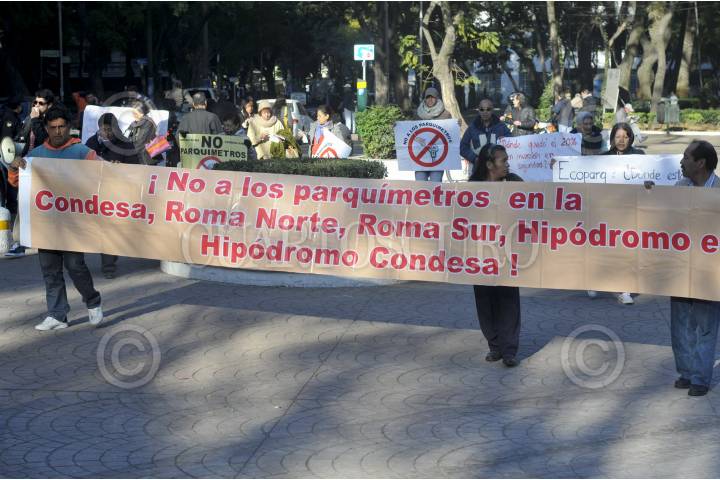 MÉXICO, D.F., 20ENERO2014.- Vecinos de la colonia Condesa, Roma e Hipódromo, realizaron una marcha del Parque México rumbo a la avenida Insurgentes donde caminaron de la calle Sonora hasta Álvaro Obregón, la manifestación se realizó por el primer aniversario de la colocación de parquimetros en la zona, los vecinos se declaran en contra de la empresa Ecoparq, argumentando que esta no ha solucionado los problemas de vialidad e inseguridad a los que se había comprometido junto con el gobierno. FOTO: DIEGO SIMÓN SÁNCHEZ /CUARTOSCURO.COM