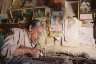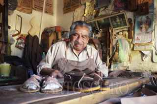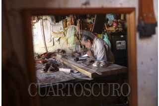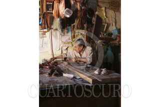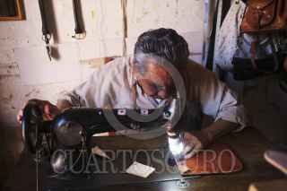 SAN CRISTOBAL DE LAS CASAS, CHIAPAS, 21ENERO2014.- Don Augusto Burgeti tiene 80 años y mas de 60 trabajando en el oficio de talabartería, unas de las artesanías sobresalientes de esta ciudad, que consiste en fabricar artículos de cuero y es una arte que se hereda por generaciones. Acompañado con con su antigua maquina de coser, fabrica todo tipo de artículos como bolsas, cinturones y zapatos, mochilas, billeteras etc. FOTO: ELIZABETH RUIZ /CAURTOSCURO.COM