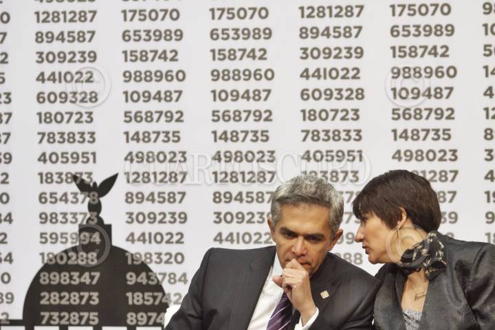 MÉXICO, D.F., 24ENERO2014.-Miguel Ángel Mancera, Jefe de Gobierno, conversa con Jacqueline L ' Hoist Tapia, presidenta del Consejo para Prevenir la Discriminación, durante el acto conmemorativo por las víctimas del Holocausto, perpetrado por el régimen nazista. La ceremonia se realizo en el Antiguo Palacio del Ayuntamiento. FOTO: MOISÉS PABLO /CUARTOSCURO.COM