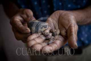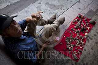 CULIACÁN, SINALOA, 25ENERO2014.-José Pesina, de 75 años, originario de Nuevo León, vende fósiles de animales, por lo regular almejas, caracoles, patas de mula y una que otra moneda antigua. Actualmente vive en el municipio de Navolato, desde hace 42 años, sin embargo, a veces va a su pueblo de origen y trae dichas piedras para sacar un poco de dinero, lo cual le servirá para comprar cacahuates y venderlos en el centro del municipio antes mencionado. Pesina no tiene un ojo ya que lo perdió por una infección, él como muchas otras personas de edad mayor, tiene que ser vendedores ambulantes para poder tener el mínimo ingreso para subsistir. FOTO: RASHIDE FRIAS /CUARTOSCURO.COM