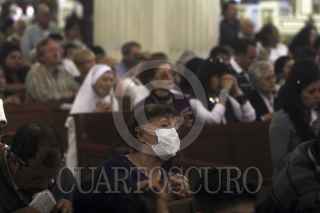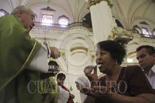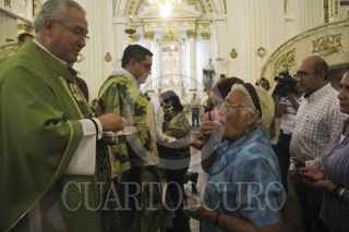GUADALAJARA, JALISCO, 26ENERO2013.- Hoy en la Catedral Metropolitana de esta ciudad, el Cardenal José Francisco Robles Ortega, oficio la eucaristía de las del medio día, en donde indico a su feligresía algunas medidas preventivas para combatir la propagación del virus de la influenza, así mismo al momento de la comunión esta fue entregada en las manos de los asistentes. También durante la Homilía comento sobre la problemática que se vive en el estado de Michoacán. Como medida de protección a la salud, la ostia se entregó en la mano y no directamente en la boca. FOTO: FERNANDO CARRANZA GARCIA/CUARTOSCURO.COM