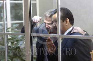 MÉXICO, D.F., 28ENERO2014.- Los senadores Fernando Mayans Canabal y Luis Sánchez Jiménez observan curiosos a través de una ventana la conferencia del Jefe de Gobierno Miguel Ángel Mancera, quien asistió como invitados a la 4a Reunión Plenaria del Grupo Parlamentario del PRD en la Cámara Alta. FOTO: MOISÉS PABLO /CUARTOSCURO.COM