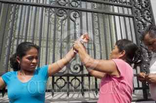 VILLAHERMOSA, TABASCO, 28ENERO2014.- Alicia Jiménez Hernández de 31 años de edad, oriunda de la comunidad indígena de San Carlos, Macuspana, permanece encadenada al acceso principal del Palacio de Gobierno y advirtió que permanecerá de esa manera hasta que el gobernador Arturo Núñez Jiménez cumpla con lo prometido acerca de fomentar el empleo a través de una maquiladora textil en la región. Al menos un grupo de cien mujeres esperan que el gobernador cumpla con su promesa; en su mayoría son madres solteras. FOTO: MARCO POLO GUZMÁN HERNÁNDEZ /CUARTOSCURO.COM