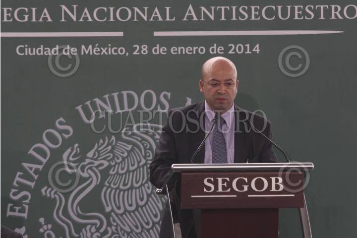 MÉXICO, D.F., 28ENERO2014.- Miguel Ángel Mancera, Jefe de Gobierno, saluda a Miguel Ángel Osorio Chong, Secretario de Gobernación, durante la presentación de la estrategia nacional antisecuestro en la sede de la SEGOB. Los observa Jesús Murillo Karam, Procurador General de Justicia. FOTO: CUARTOSCURO.COM