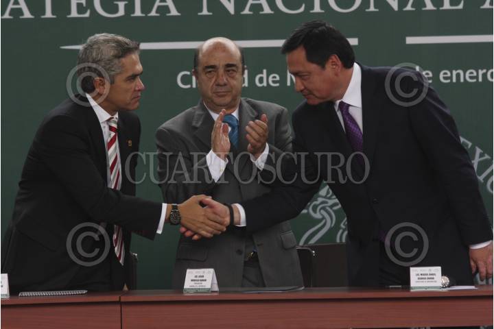 MÉXICO, D.F., 28ENERO2014.- Miguel Ángel Mancera, Jefe de Gobierno, saluda a Miguel Ángel Osorio Chong, Secretario de Gobernación, durante la presentación de la estrategia nacional antisecuestro en la sede de la SEGOB. Los observa Jesús Murillo Karam, Procurador General de Justicia. FOTO: CUARTOSCURO.COM