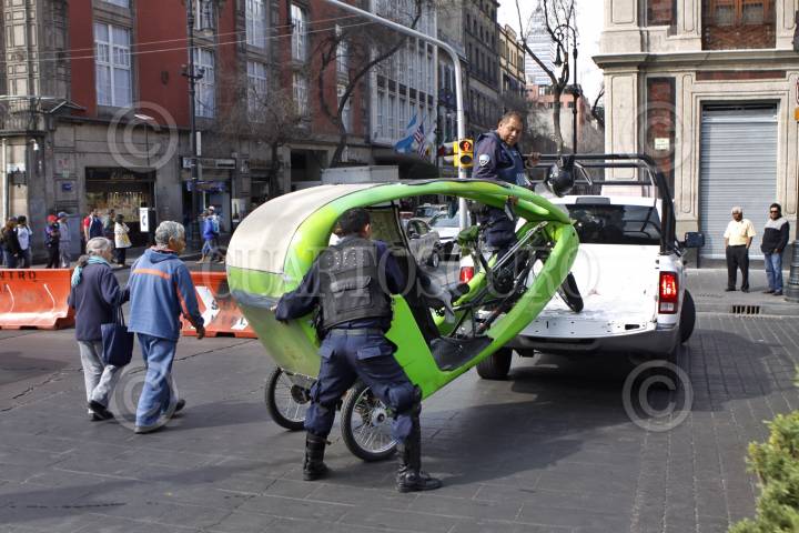 MÉXICO, D.F., 29ENERO2014.- Policías de la SSPDF adscritos al cuerpo encargado de combatir el comercio informal en la zona centró de la capital, se llevaron esta mañana a los carritos eléctricos que se ocupan para trasladar a los paseantes por esta zona, los propietarios argumentaron que ellos tienen los permisos correspondientes para ejercer esta actividad. FOTO: MOISÉS PABLO /CUARTOSCURO.COM