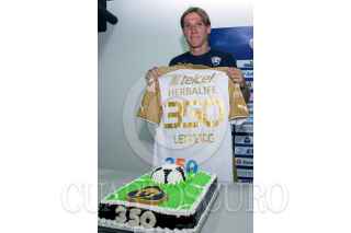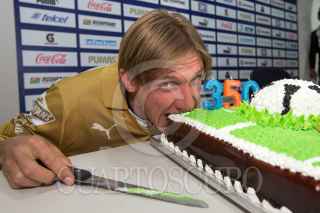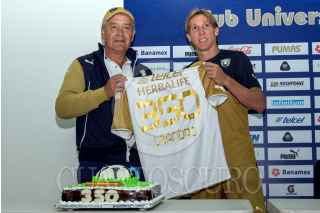 MÉXICO, D.F., 30ENERO2014.- Leandro Augusto, jugador de los Pumas de la UNAM, cumplir el próximo domingo 350 partidos disputados con la camiseta de los felinos. Por ello, le dieron una playera conmemorativa y un pastel. FOTO: CUARTOSCURO.COM