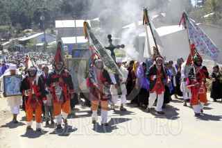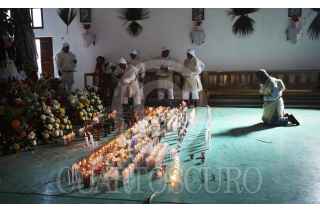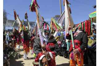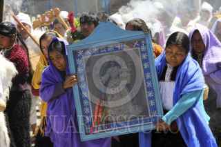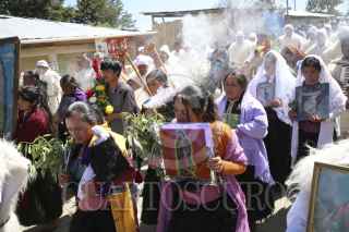 SAN CRISTOBAL DE LAS CASAS, CHIAPAS,02FEBRERO2014.- Indígenas tzotziles SON encabezados por mashes u hombres mono, los cuales son los personajes que alegran las festividades patronales en Los Altos de Chiapas, durante una procesión para festejar el día de La Candelaria en el ejido del mismo nombre, a unos kilómetros de la ciudad de San Cristóbal de Las Casas. Durante el festejo se prenden candelas o velas y se aprovecha para bendecir las imágenes de los santos que les protegerán en sus casas. FOTO: ELIZABETH RUIZ /CUARTOSCURO.COM