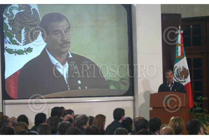 MÉXICO DF 30NOVIEMBRE2005ª- Victor Manuel Borras director General del Instituto del Fondo Nacional de la Vivienda para los Trabajadores INFONAVIT y el Presidente de la Republica Mexicana Vicente Fox, Eduardo Sojo Garza Aldape, Jefe de la Oficina de la Presidencia para las Políticas Públicas y Leon Halkin Bider, Presidente de la Confederación de Cámaras Industriales de los Estados Unidos Mexicanos, durante la clausura de la 89 Asamblea General del INFONAVIT FOTO: Leonardo Casas/CUARTOSCURO.COM