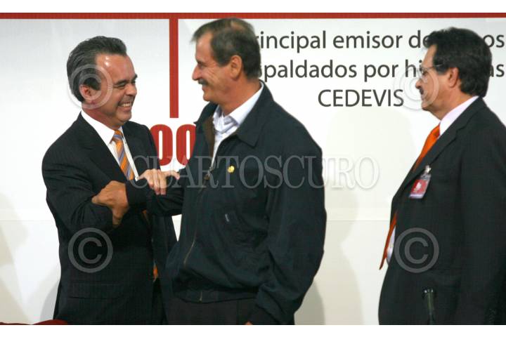 MÉXICO DF 30NOVIEMBRE2005ª- Victor Manuel Borras director General del Instituto del Fondo Nacional de la Vivienda para los Trabajadores INFONAVIT y el Presidente de la Republica Mexicana Vicente Fox, Eduardo Sojo Garza Aldape, Jefe de la Oficina de la Presidencia para las Políticas Públicas y Leon Halkin Bider, Presidente de la Confederación de Cámaras Industriales de los Estados Unidos Mexicanos, durante la clausura de la 89 Asamblea General del INFONAVIT FOTO: Leonardo Casas/CUARTOSCURO.COM