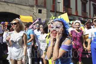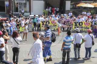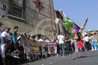 CUERNAVACA, MORELOS, 05FEBRERO, 2014.- Decenas de cirqueros integrantes de la Asociación de Circos Mexicanos marcharon por las calles de Cuernavaca para manifestarse en contra de la prohibición de circos con animales. Realizaron actos de acrobacia en su recorrido hasta llegar al Congreso del Estado. FOTO: PATRICIA MORALES /CUARTOSCURO.COM