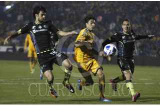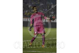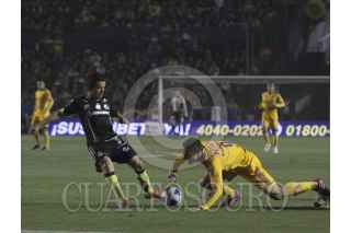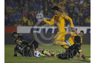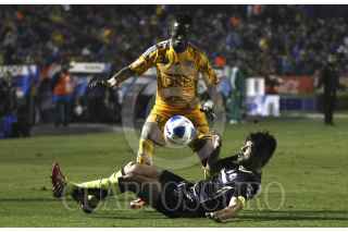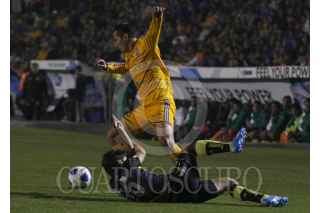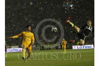 MONTERREY, NUEVO LEÓN, 08FEBRERO2014.- Hernán Burbano del equipo de los Tigres en un duelo por el balón contra Nestor Araujo del equipo de Santos Laguna, en el estadio universitario, partido correspondiente a la jornada 6 de la Liga MX. Final 1 - 1. FOTO: GABRIELA PÉREZ MONTIEL / CUARTOSCURO.COM