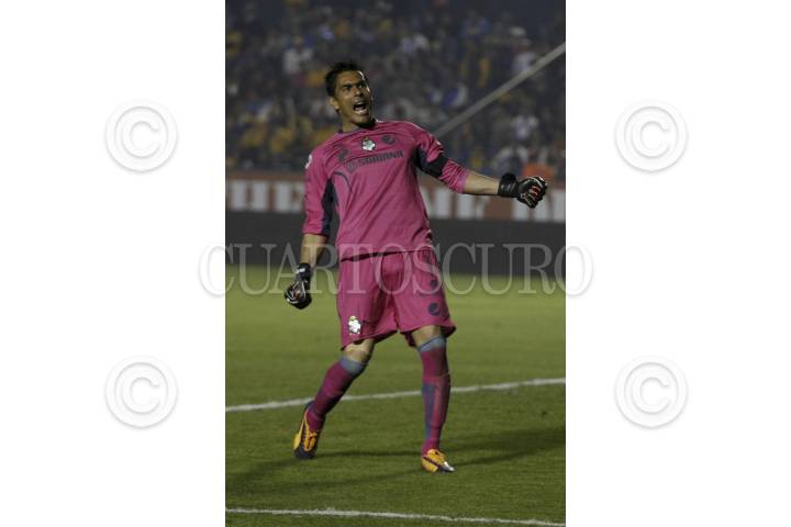 MONTERREY, NUEVO LEÓN, 08FEBRERO2014.- Hernán Burbano del equipo de los Tigres en un duelo por el balón contra Nestor Araujo del equipo de Santos Laguna, en el estadio universitario, partido correspondiente a la jornada 6 de la Liga MX. Final 1 - 1. FOTO: GABRIELA PÉREZ MONTIEL / CUARTOSCURO.COM