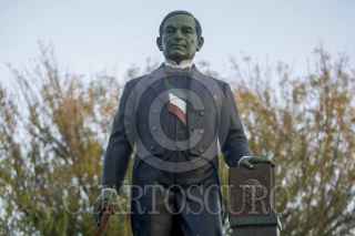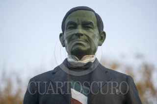 SAN NICOLÁS DE LOS GARZA, NUEVO LEÓN, 12FEBRERO2014.- Al celebrarse el 150 Aniversario de la visita a Monterrey, el ayuntamiento de San Nicolás intentó reconstruir el monumento de Benito Juárez ubicado en la Plaza Juárez, aunque quedó pintada de verde en rostro y manos, situación que ha causado polémica. FOTO: GABRIELA PÉREZ MONTIEL / CUARTOSCURO.COM