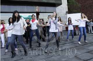 MÉXICO, DF., 12FEBRERO2014.- Al termino de la conferencia de prensa sobre el evento "Un billón de pie” organizada por la Comisión de Igualdad de Género, se realizo una coreografia en el frontispicio de la Cámara de Diputados. FOTO: RODOLFO ANGULO /CUARTOSCURO.COM