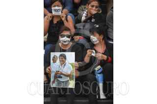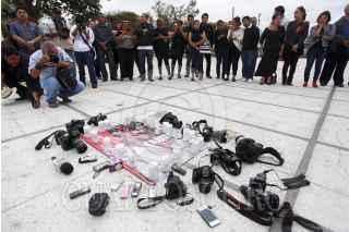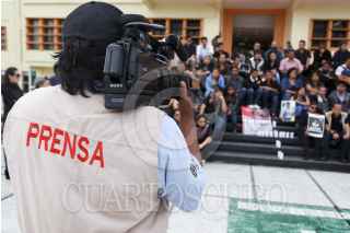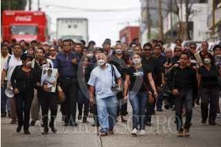 COATZACOALCOS, VERACRUZ, 12FEBRERO2014.- Periodistas de diversos medios de comunicación, quienes iban vestidos de negro, realizaron una marcha silenciosa por las principales calles de Coatzacoalcos hasta llegar a la congregación de Villa Allende, en donde se velan los restos del reportero de nota roja, Gregorio Jiménez de la Cruz, desaparecido el pasado 05 de febrero. FOTO: FÉLIX MÁRQUEZ / CUARTOSCURO.COM
