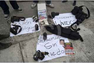 BOCA DEL RÍO, VERACRUZ, 12FEBRERO2014.- Reporteros, periodistas gráficos y editores protestaron esta mañana por el asesinato del comunicador Gregorio Jiménez de la Cruz. Los informantes se reunieron en el monumento a los valores y convocaron para una nueva manifestación en las próximas horas. FOTO: ILSE HUESCA /CUARTOSCURO.COM