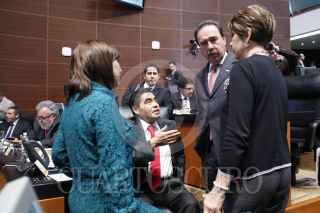 MÉXICO, D.F., 13FEBRERO2014.- Los senadores Cristina Díaz Salazar, PRI, Miguel Barbosa, coordinador del PRD, Emilio Gamboa, coordinador del PRI y Angélica de la Peña, PRD, durante la sesión en la Cámara de Senadores. FOTO: CUARTOSCURO.COM