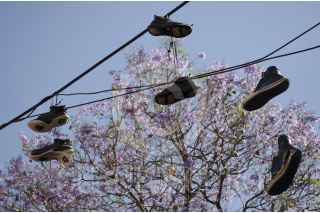 MÉXICO, DF., 15FEBRERO2014.- ¿Qué significan los zapatos colgados de los cables? Un rumor: que se venden drogas en tal lugar, que allí murió algún ladrón y por eso, como se diría coloquialmente, "colgó los tenis" , o también es indicio de una zona libre de policías, lejos de la autoridad. Sólo rumores. FOTO: MARÍA JOSÉ MARTÍNEZ /CUARTOSCURO.COM