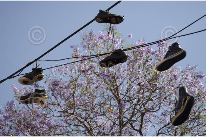 MÉXICO, DF., 15FEBRERO2014.- ¿Qué significan los zapatos colgados de los cables? Un rumor: que se venden drogas en tal lugar, que allí murió algún ladrón y por eso, como se diría coloquialmente, "colgó los tenis" , o también es indicio de una zona libre de policías, lejos de la autoridad. Sólo rumores. FOTO: MARÍA JOSÉ MARTÍNEZ /CUARTOSCURO.COM