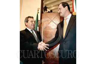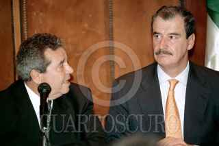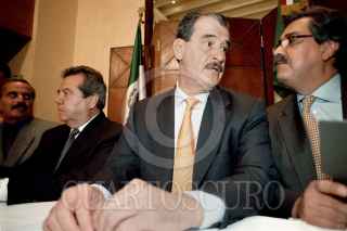 Porfirio Muñoz Ledo, Vicente Fox Quesada y Rodolfo Elizondo conversan durante la firma de un acuerdo de convergencia y cooperación política.