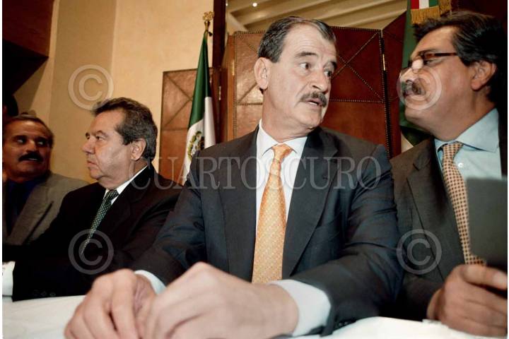 Porfirio Muñoz Ledo, Vicente Fox Quesada y Rodolfo Elizondo conversan durante la firma de un acuerdo de convergencia y cooperación política.