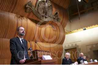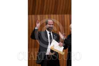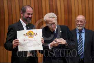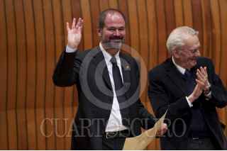 MÉXICO, D.F., 25FEBRERO2014.- Juan Villoro, ingresó al Colegio Nacional. Manuel Peimbert, le entregó la carta de ingreso, así como un pin en la ceremonia que se levó a cabo en El Colegio Nacional. FOTO: IVAN STEPHENS /CUARTOSCURO.COM