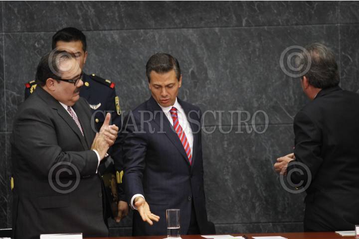 MÉXICO, D.F., 06MARZO2014.- Fernando Abusaid Quinard, presidente de la Cámara Nacional de Vivienda (Canadevi), Jorge Carlos Ramírez Marín, secretario de Desarrollo Agrario, Territorial y Urbano y Enrique Peña Nieto, Presidente de México, durante la ceremonia en donde se entregó el Premio Nacional de Vivienda, en la residencia oficial de Los Pinos. FOTO: MOISÉS PABLO /CUARTOSCURO.COM