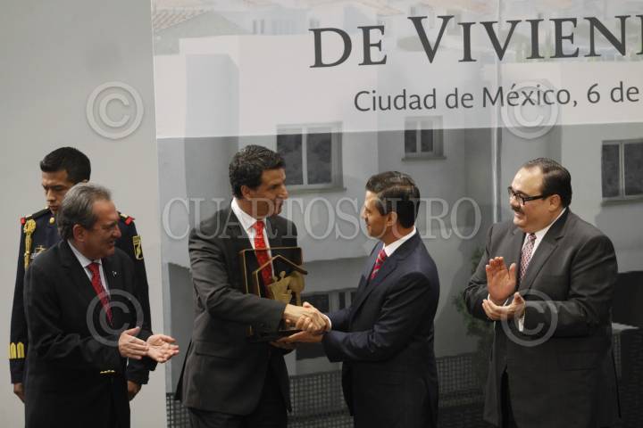 MÉXICO, D.F., 06MARZO2014.- Fernando Abusaid Quinard, presidente de la Cámara Nacional de Vivienda (Canadevi), Jorge Carlos Ramírez Marín, secretario de Desarrollo Agrario, Territorial y Urbano y Enrique Peña Nieto, Presidente de México, durante la ceremonia en donde se entregó el Premio Nacional de Vivienda, en la residencia oficial de Los Pinos. FOTO: MOISÉS PABLO /CUARTOSCURO.COM