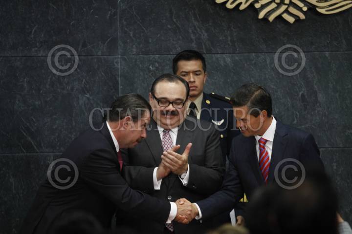 MÉXICO, D.F., 06MARZO2014.- Fernando Abusaid Quinard, presidente de la Cámara Nacional de Vivienda (Canadevi), Jorge Carlos Ramírez Marín, secretario de Desarrollo Agrario, Territorial y Urbano y Enrique Peña Nieto, Presidente de México, durante la ceremonia en donde se entregó el Premio Nacional de Vivienda, en la residencia oficial de Los Pinos. FOTO: MOISÉS PABLO /CUARTOSCURO.COM