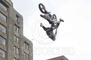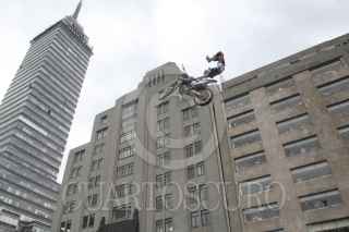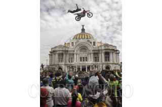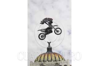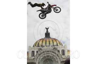 MÉXICO, D.F., 09MARZO2014.- El rider mexicano Érick Ruiz y el chileno Javier Villegas tuvieron este domingo una primera experiencia de lo que vivirán el próximo viernes 14 de marzo en la Plaza de Toros México durante la primera parada de Red Bull X-Fighters 2014. Frente a cinco mil personas, realizaron junto a Álex Cervantes una exhibición de Freestyle Motocross con el esplendoroso Palacio de Bellas Artes de la Ciudad de México de fondo. FOTO: LUIS CARBAYO /CUARTOSCURO.COM