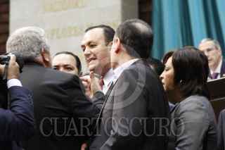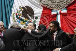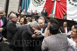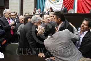 MÉXICO, D.F., 18MARZO2014.- El diputado Manuel Huerta Ladrón de Guevara, diputado del Partido del Trabajo, protagonizó una serie de empujones con el diputado priista José Rangel Espinosa, durante la discusión parlamentaria en torno al seguro de desempleo y la pensión universal en el recinto legislativo de San Lázaro, luego de que con 184 votos a favor y 238 en contra, el pleno rechazó someter a discusión cuatro mociones suspensivas en torno al dictamen correspondiente a estos rubros. Los ánimos se encendieron ante la tentativa fallida de diputados de Movimiento Ciudadano por tomar la tribuna. FOTO: CUARTOSCURO.COM
