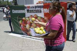 MÉXICO, D.F., 19MARZO2014.- Integrantes del Barzón regalo manzana de producción nacional en rechazo a la venta de manzana proveniente de Estados Unidos, y es que a decir de esta organización social los productores se topan con una competencia desleal. El Senado hace unos días había hecho un exhorto a que se detuviera la venta de manzana estadounidense que tiene inundados los mercados nacionales ya que hay indicios de que ésta fue tratada con químicos para que el fruto resistiera mayores temporadas en refrigeración, los cuales no fueron aprobados por la autoridad sanitaria mexicana correspondiente FOTO: MOISÉS PABLO /CUARTOSCURO.COM