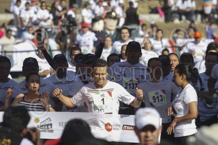 MÉXICO, D.F., 22MARZO 2014.- Roberto Miranda, Jefe del Estado Mayor y Enrique Peña Nieto, Presidente de México, encabezaron la carrera Molino del rey en el Bosque de Chapultepec. El Jefe del ejecutivo hizo en 53 minutos la carrera que organiza el Estado Mayor Presidencial; el año pasado hizo un tiempo de 54 minutos. En la imagen el Jefe del Ejecutivo se tomo la foto con los ganadores de las diferentes categorías. FOTO: MOISÉS PABLO /CUARTOSCURO.COM