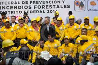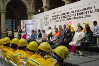 MÉXICO, DF., 22MARZO2014.- Miguel Ángel Mancera, jefe de gobierno capitalino, presentó el Programa Integral de Combate a Incendios Forestales 2014, evento al que asistió el Heroico Cuerpo de Brigadistas, el grupo Cóndores, brigadistas de Protección Civil y personal de Bomberos. Acompañado de la secretaria de turismo, Tanya Müller, el delegado de Xochimilco, Miguel Ángel Cámara, Fausto Lugo, director de Protección Civil y Ramón Aguirre Díaz, director del Sistema de Aguas de la Ciudad de México, declaró que tan sólo en este año se presentaron aproximadamente 250 incendios, los cuales provocaron la afectación de trescientas hectáreas de zonas boscosas en la zona metropolitana. La campaña de prevención ante incendios forestales busca concientizar a la población de las delegaciones Tláhuac, Magdalena Contreras, Tlalpan, Xochimilco y Milpa Alta. Las altas temperaturas de la temporada ponen en jaque a los pulmones de la capital, es por eso que el programa busca la prevención ante posibles riesgos. FOTO: MARÍA JOSÉ MARTÍNEZ /CUARTOSCURO.COM