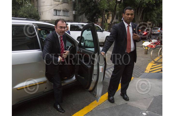 MÉXICO, D.F., 24MARZO2014.- Luis Videgaray, secretario de Hacienda, acudió a la ponencia "Oportunidades y Riesgos de las Asociaciones Público Privadas", de Eduardo Engel, autor del libro Economía de las asociaciones público-privadas, que se realizó en el marco del 80 Aniversario de la revista "Trimestre Económico" en la librería Rosario Castellanos. En la imagen, con el investigador Engel. FOTO: ISAAC ESQUIVEL /CUARTOSCURO.COM