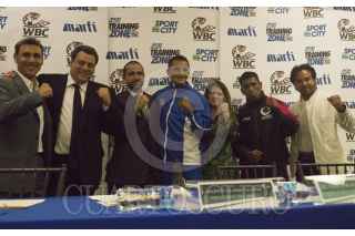 MÉXICO, DF., 25MARZO2014.- Mauricio Sulaimán, actual presidente del Consejo Mundial de Boxeo, presentó a Daniel Estrada, aspirante número uno al título mundial de peso ligero, ante empresarios de Sport City y Cristina Aceves, del Comité de medallistas olímpicos de México. Presentó además la campaña “Cinturón de oro”, en donde se promueven nuevos y jóvenes talentos boxísticos en el marco del Día Internacional del Deporte para el Desarrollo de la Paz. FOTO: MARÍA JOSÉ MARTÍNEZ /CUARTOSCURO.COM