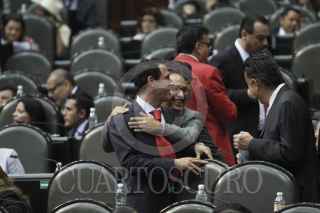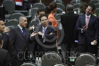 MÉXICO, D.F., 25MARZO2014.- Manlio Fabio Beltrones, coordinador de los diputados del PRI, Silvano Aureoles Conejo, coordinador de los diputados del PRD, y Héctor Gutiérrez de la Garza, durante la sesión en la cual se aprobó en lo general la Ley General de Competencia Económica que envió el presidente Enrique Peña Nieto el pasado 19 de febrero. La ley fue aprobada con votación de 397 votos a favor, 45 en contra y dos abstenciones. FOTO: MOISÉS PABLO /CUARTOSCURO.COM