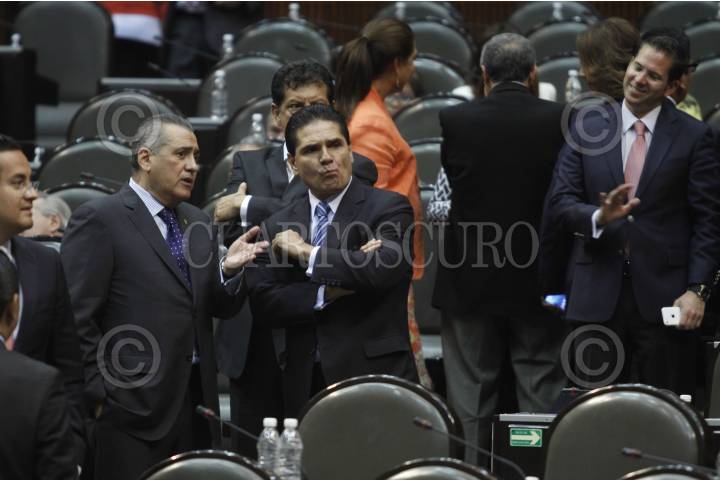 MÉXICO, D.F., 25MARZO2014.- Manlio Fabio Beltrones, coordinador de los diputados del PRI, Silvano Aureoles Conejo, coordinador de los diputados del PRD, y Héctor Gutiérrez de la Garza, durante la sesión en la cual se aprobó en lo general la Ley General de Competencia Económica que envió el presidente Enrique Peña Nieto el pasado 19 de febrero. La ley fue aprobada con votación de 397 votos a favor, 45 en contra y dos abstenciones. FOTO: MOISÉS PABLO /CUARTOSCURO.COM