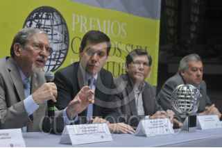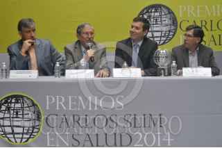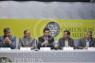 MÉXICO, D.F., 26MARZO2014.- Conferencia de prensa donde el Instituto Carlos Slim de la Salud, encabezado por Ricardo Mújica, director ejecutivo, presentó a los ganadores de este año en sus dos categorías; por Trayectoria en Investigación se reconoció al doctor Lourival Possani, profesor emérito de la UNAM, y por categoría en Instituto Excepcional se reconoció al grupo Medicus Mundi, encabezado por los doctores Juan Carlos Verdugo, de Guatemala, Javier Román, de Bolivia, y Fernando Carbone, de Perú. El instituto que otorga los premios busca reconocer a quienes generan soluciones innovadoras, sustentables y repicables para atender los principales problemas de salud en México y Latinoamérica. FOTO: DIEGO SIMÓN SÁNCHEZ /CUARTOSCURO.COM