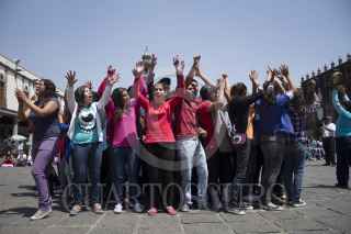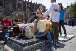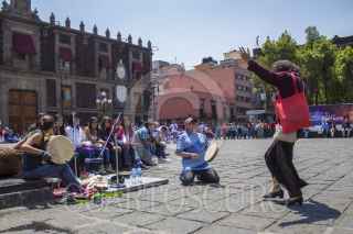 MEXICO, D.F., 29MARZO2014.-El día de hoy se llevó a cabo un taller de teatro callejero con estudiantes pertencientes al programa Prepa Sí, en la plaza de Santo Domingo. Los jovenes, quienes venían de la zona norte de la ciudad, se expresaron bailando al ritmo de música interpretada principalmente con percusiones prehispánicas. Bailaron por toda la plaza y al final invitaron a los espectadores a integrarse con ellos. FOTO: DAVID POLO /CUARTOSCURO.COM