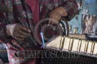 MÉXICO, DF., 01ABRIL2014.- Desde los diez años Juan José es soldador de radiadores. Su padre le enseñó el oficio que hoy es considerado practicamente artesanal. Con un soplete y estaño fundido solda los radiadores de sus clientes. "Casi todos los coches de ahora están hechos de aluminio, que en nada se compara con la duración del estaño". FOTO: MARÍA JOSÉ MARTÍNEZ /CUARTOSCURO.COM