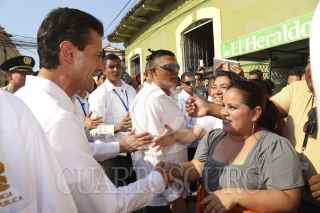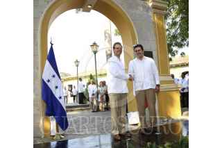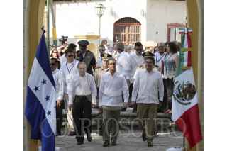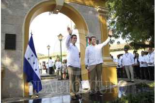 COMAYAGUA, HONDURAS, 02ABRIL2014.- Como parte de su Visita Oficial a la República de Honduras, en la Plaza Central de esta ciudad el Presidente Enrique Peña Nieto y el Primer Mandatario de esta nación, Juan Orlando Hernández Alvarado, se tomaron la fotografía oficial. Luego, acompañado por el Presidente hondureño, caminó a la Caxa Real, sede de la Alcaldía de Comayagua. A su paso, saludó a niños hondureños que ondeaban las banderas de ambos países. FOTO: PRESIDENCIA /CUARTOSCURO.COM