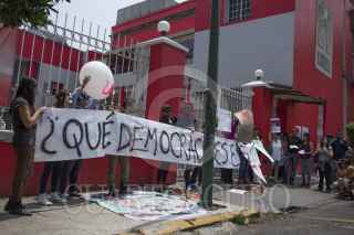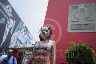 MÉXICO, D.F., 03ABRIL2014.- Un grupo de jóvenes, se manifestaron en el edificio del Partido Revolucionario Institucional en el D.F. ante la red de prostitución que dio a conocer Carmen Aristegui en su noticiero sobre Cuauhtémoc Gutiérrez de la Torre, dirigente del PRI-DF. FOTO: ENRIQUE ORDÓÑEZ /CUARTOSCURO.COM